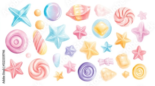candy and sweets watercolor collection isoleate background Collection set watercolor. Colorful assorted shapes and patterns.