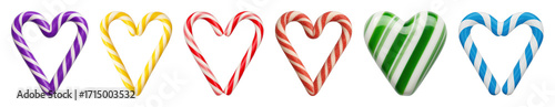 Candy cane heart set including purple, yellow, red, green, and blue striped variations isolated. Festive holiday and sweet treat collection.