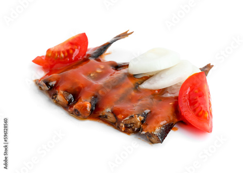 Canned fish in tomato sauce with vegetables isolated on white background