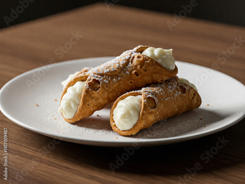 Cannoli Siciliani on a white plate, Wooden dining table background.
