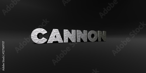 CANNON - hammered metal finish text on black studio - 3D rendered royalty free stock photo. This image can be used for an online website banner ad or a print postcard.