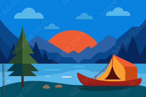Canoe Beside Tent on Quiet Lakeshore at Dawn