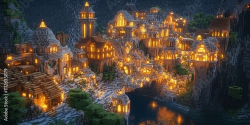 Canyon City Glow, an enchanting metropolis nestled in a vast canyon, aglow with warm golden lights amidst towering rock formations