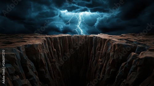 Canyon National Park Landscape desert concept. A dark, dramatic landscape featuring a deep chasm under ominous storm clouds illuminated by lightning.