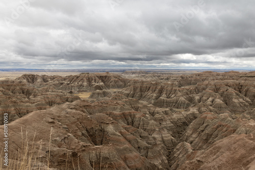 Canyons at Badlands National Park under a darkened sky with looming clouds in South Dakota