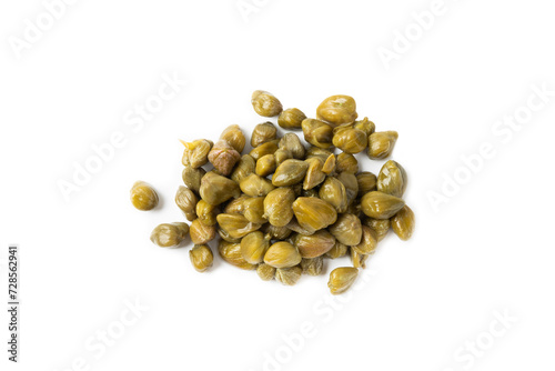 Capers isolated on white background. Marinated caper buds, small salted capparis in bowl, fermented food, pickled capers group.Organic spices and seasonings.