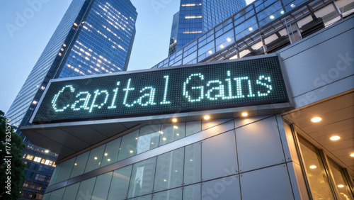Capital gains tax business goals finance sign on modern office building at dusk glowing LED display conveys financial success and corporate ambition