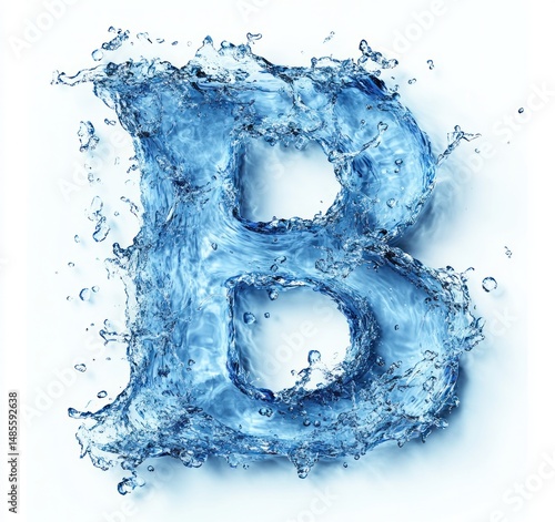 Capital letter B formed by dynamic splashing and flowing clear blue water droplets against a white background conveying freshness and fluidity