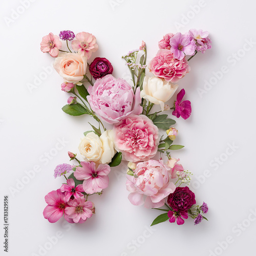 Capital letter "X" formed by colorful flowers , pink light blush to deep fuchsia, creams, whites and red,peonies,roses.