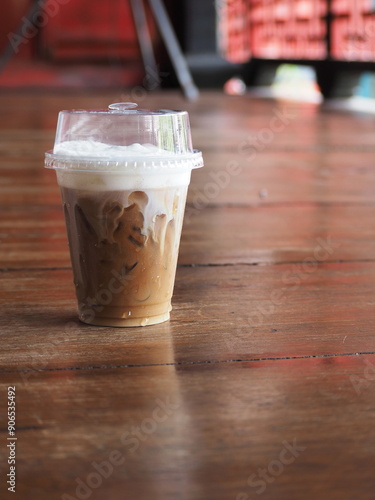 Cappuccino with ice cube, white milk foam and covered with plastic lid in takeaway cup on a wooden table. Ice coffee in clear plastic glass. Favorite Caffeine beverage manu. Freddo cappuccino