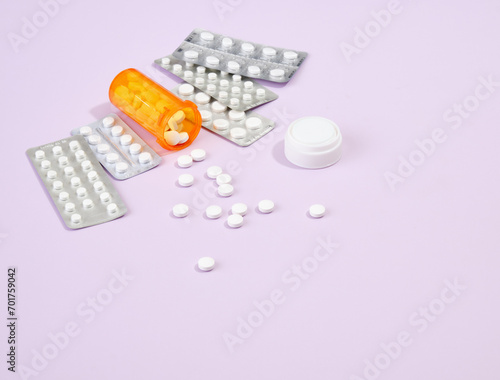 Capsules and tablets in blister packs on table. White pills scattered from the orange pill jar. Copy space for text.
