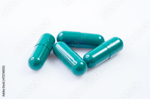 Capsules of green herbal supplement product isolated on white background