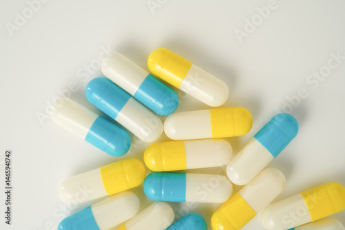 Capsules pill white blue yellow scattered on white surface, health care, medical background