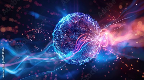 Captivating abstract neon energy sphere, composed of glowing particles and waves, set against a dark background for a magical effect.