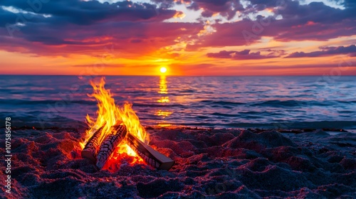 Captivating Coastal Campfire Sunset Vibrant Sky and Glowing Flames Along the Shoreline