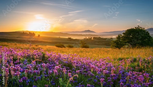 captivating countryside scene at sunrise with blooming purple flowers in a spring meadow and wildflowers at sunset creating a serene summer panoramic view with copy space image