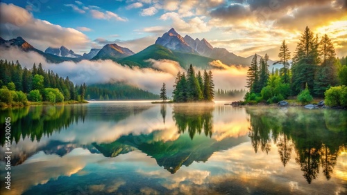 Captivating Foggy Mountain Lake - Serene Nature Landscape, Tranquil Waters, Misty Peaks, Outdoor Adventure, Peaceful Retreat, Scenic Beauty, Reflection Photography, Wilderness Escape