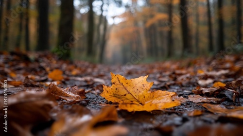 Captivating forest pathway blanketed in autumnal foliage with a focus leaf