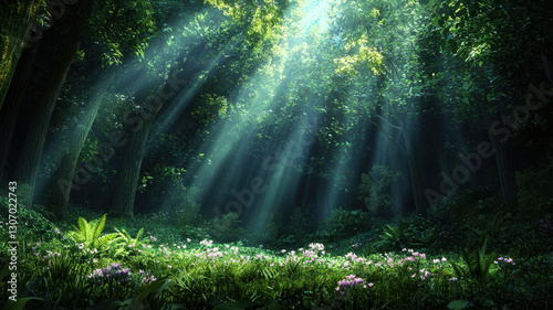 Captivating forest scene with sunbeams piercing through trees, creating serene atmosphere
