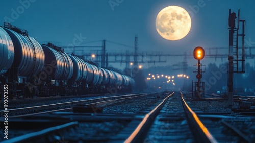 Captivating freight rail yard under the full moon a nighttime industrial view
