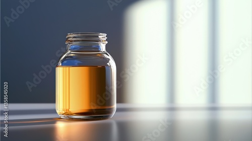 Captivating glass jar of amber liquid on table indoor setting still life natural light artistic perspective