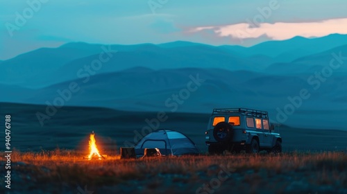 Captivating image of an adventurous road trip camping setup with a cozy campfire under the deep starry night sky Showcases the freedom tranquility and scenic beauty of outdoor and leisure