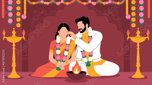 Captivating Indian wedding couple vector illustration, celebrating love and tradition in a vibrant ceremonial setting with garlands and sacred fire, perfect for cultural designs