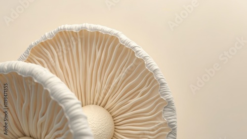 Captivating indoor shot featuring two pristine white mushroom caps framing a creamy orb at their heart, with one cap artfully cropped from below left, inviting mystery and intrigue