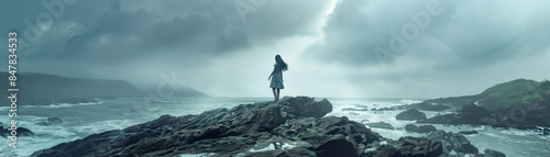 Captivating Ocean View A Majestic Woman Standing on Rugged Rocks Underneath Stormy Skies, Embracing Nature's Untamed Beauty