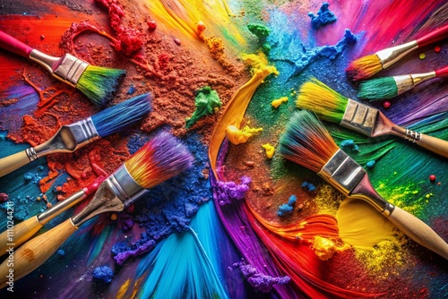 Captivating Panoramic View of a Colorful Canvas with Vibrant Paint Splashes and Brushes Creating Artistic Patterns on a Textured Surface