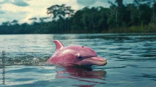 Captivating Scene of a Pink Dolphin Swimming Gracefully in a Serene River Surrounded by Lush Vegetation and Tranquil Waters