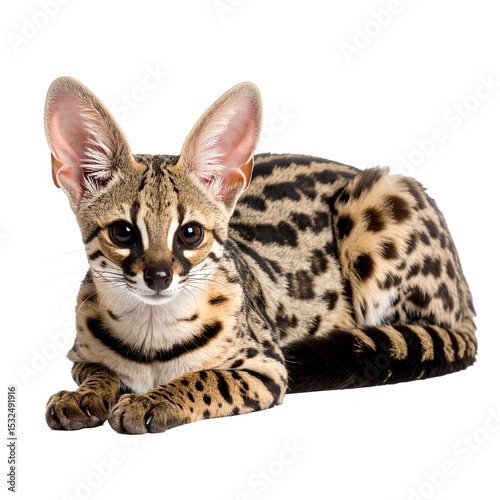 Captivating serval kitten resting gracefully displaying unique spotted pattern on transparent background
