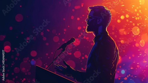 Capture a dynamic, tilted angle view of a person giving a speech in a realistic digital illustration Highlight expressive gestures and emotions