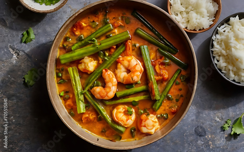 Capture the essence of Okra and Shrimp Curry in a mouthwatering food photography shot
