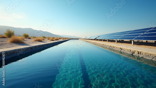 Capture the essence of solar desalination projects with cutting-edge technology, showcasing sustainable water treatment and renewable energy integration in modern resource management.