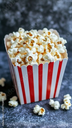 Capture the irresistible charm of freshly popped popcorn, with fluffy kernels spilling from a classic red-and-white striped container, drizzled with melted butter and sprinkled with sea salt
