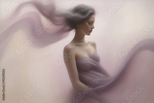 Captured in a dreamy haze, a delicate figure floats against an abstract soft background, where gentle curves of mauve and cream mingle with whispers of gray