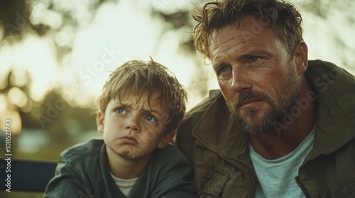 Captured in warm sunlight, a young boy and his father share a meaningful moment on a park bench, their expressions reflecting deep thought and connection in nature.