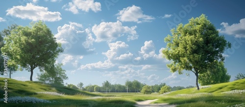 Capturing a scenic park with fluffy cumulus clouds against a clear sky in a photograph with copy space image