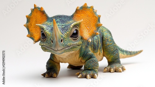 Capturing essence of youth baby Triceratops stands proudly emerging horn buds. Its scales shimmer in brown and green hues reflecting vibrant studio lighting.
