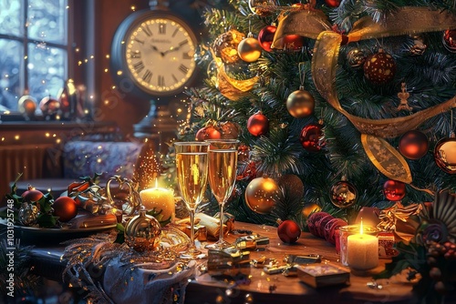 capturing the essence of New Years celebrations. The scene shows a beautifully decorated living room, with a glowing Christmas tree adorned with twinkling lights, glass ornaments, and golden ribbons