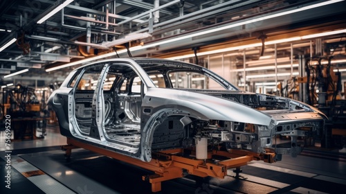 Car automobile factory assembly line. Car production line. Assembling a car on a conveyor belt.