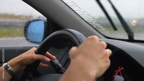 Car Dashboard and Female Hands Holding Steering Wheel When Driving in Heavy Rain