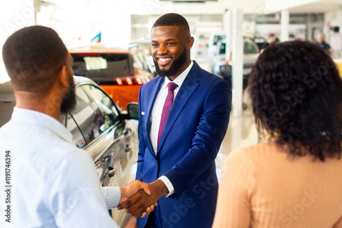 Car Dealership Concept. Salesperson Handshaking With Young Black Customers Couple In Showroom, African American Spouses Buying New Automobile In Modern Auto Salon, Selective Focus On Manager