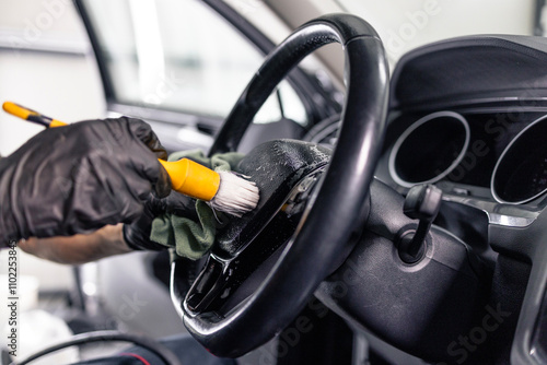 Car detailing. Cleaner using soft brush to clean dust from car steering wheel.