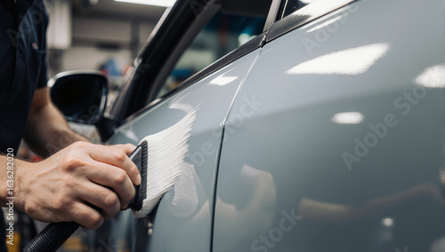 Car detailing hand brush cleaning vehicle exterior closeup shiny professional automotive care paint maintenance service workshop reflection modern transportation polish surface manual worker tool