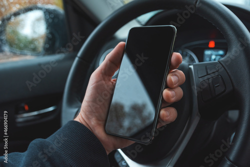 Car driver holding mobile smart phone over steering wheel, blank black screen