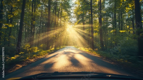 Car driving through a dense forest, sun rays breaking through the trees view from inside the car. generative ai