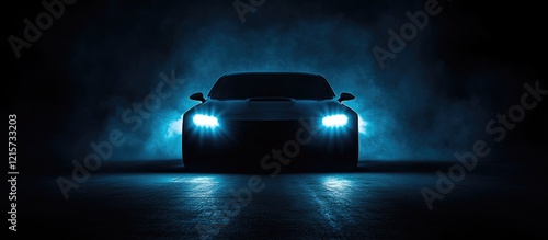 Car headlights shining brightly in the dark illustrating freedom and adventure on quiet open roads with space for text and branding.