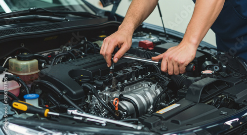 Car hood open repair, mechanic fixing engine with tools